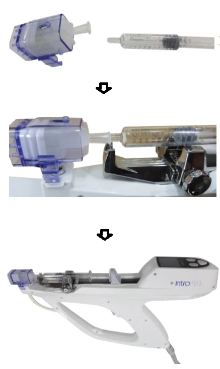4) 注射器安裝後,將注射器推板調回適當位置.