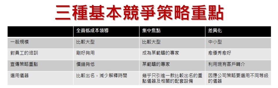 其實選擇儀器之前,美容院需要為自己選擇一個”清晰的定位”,正如開餐廳也要定義自己究竟是開茶餐廳還是日式餐廳等等。選擇好一個作招來客戶的定位,定立好自己的商業競爭策略是必須的。不論任何生意都離不開以下三種競爭策略:
