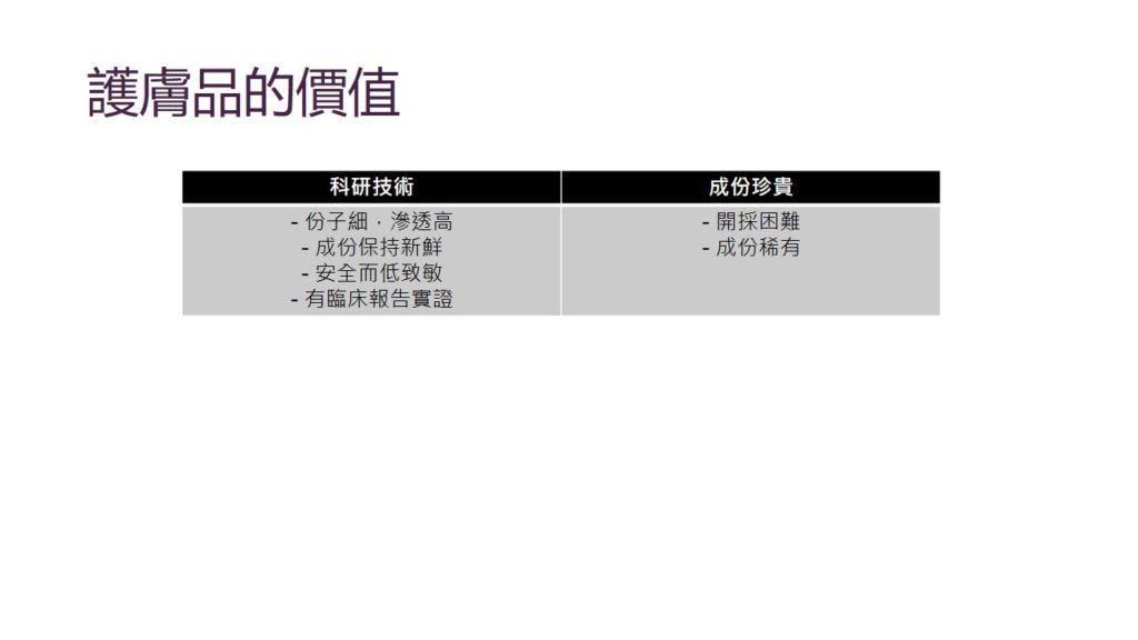 作為專業的護膚品批發及採購公司,除了重視護膚品的效用及安全性外,更重要的是其市場定位,價格、品牌、產地及市場競爭都要考慮,另外也要考慮該護膚品的配套例如試用樣板(Sample)、臨床文獻、美容院裝等。其實根本沒可能有一個品牌可以滿足所有需求,試想如有一款配套齊備、效用及利潤都不錯的護膚品在市場上推廣,估計不到2個月就不少店舖把她用不同方式降價到不再有利潤了。所以美容院、網店、護膚品專賣店等只能針對自己不同業務性質及發展情況,選擇不同的品牌。