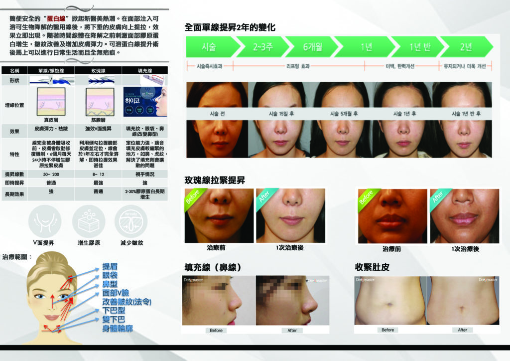 簡便安全的韓式”埋線”掀起醫美熱潮。在面部注入可溶可生物降解的醫用線後,將下垂的皮膚向上提拉,效果立即出現。隨著時間線體在降解之前刺激面部膠原蛋白增生,皺紋改善及增加皮膚彈力。可溶蛋白線提升術後馬上可以進行日常生活而且全無疤痕。蛋白線提升術以手術時間短、疼痛較少,無需全身麻醉或複雜的事後管理,施術整體更方便。