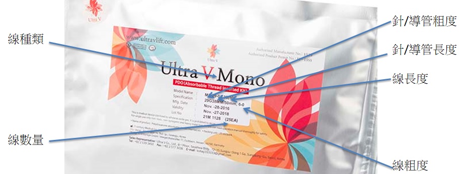 6. 線粗度: 以O作為單位,號碼愈大,線愈幼,以單線Inch最幼7-O,到較粗的1-O填充線不等愈粗的線,溶解時間愈長,但療程時及療程後的感覺也愈大,通常也會埋在皮膚比較深的位置。