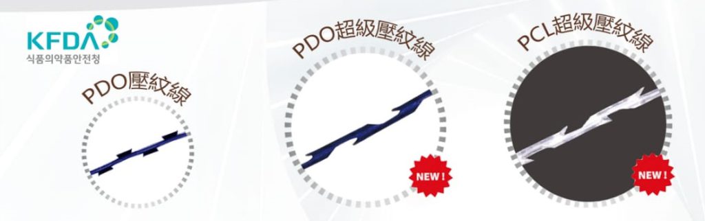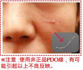 第一代蛋白線PDO(PolyDiOxanone),是經過驗證証實為最安全的生物聚合物 (Bio Polymer)材料,無論是生物穩定性還 是生物兼容性屬於「生物相容」並多年來一直用作可溶解的手術縫合線材料,極少出現敏感情況,並且通常於6個月~1年之間完全溶解,增生膠原後就大約維持半年至1年的效果。