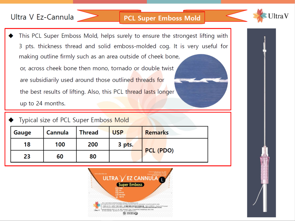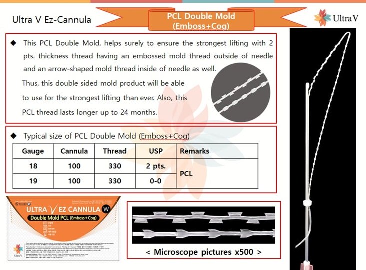 因此Ultra V 的PLLA線已經完全停產,取而代之的是第三代的PCL材料,也是少女針的主要成份,PCL物質(Poly-Caprolactone) 是經美國FDA及歐洲CE通過認證的安全物質,可刺激人體增生自身天然的膠原蛋白產生,並能即時改善面部凹陷,達至肌膚緊緻及飽滿效果。由於有增生膠原的作用,可以令皮膚層增厚,改善膚質,是一種比較受歡迎的線材,尤其是當作填充線耐用度及效果更佳。